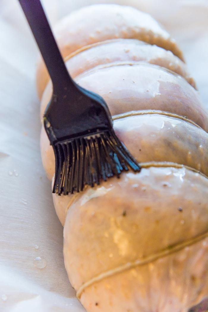 I won’t be going into details on HOW to prepare the turkey roulade in this post, because I shared a comprehensive, STEP BY STEP tutorial right here, where I talked about prepping the turkey roulade with a full turkey breast cut. I prefer to tie up the turkey roll with twine, and leave it in the fridge overnight.