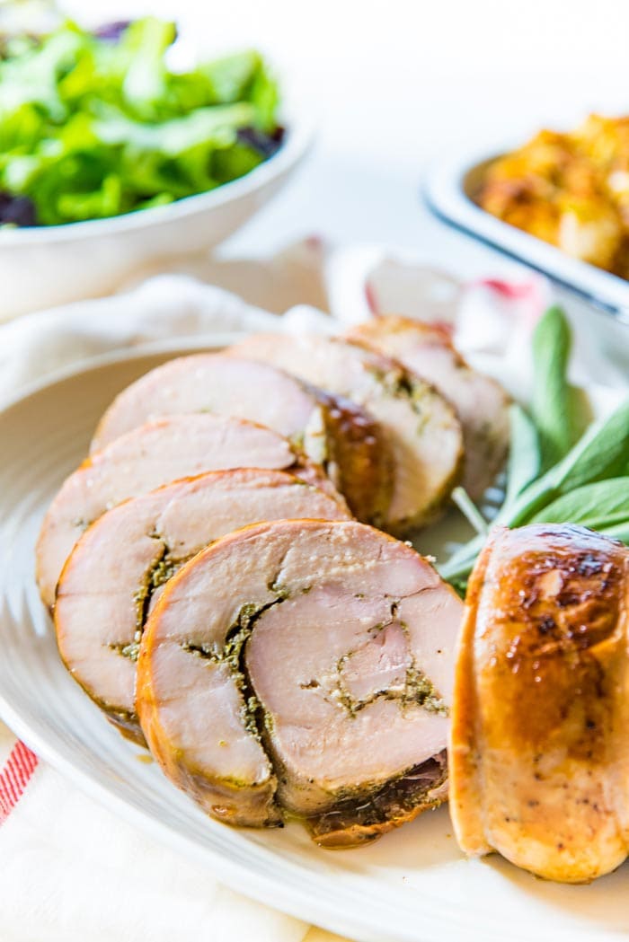 Sage is easily my favorite herb to use with turkey and chicken. It perfectly complements poultry dishes like this one, and even pork for that matter. But the combination of sage and rosemary, really makes this oven roasted turkey roulade stand out. I’m a big fan of porchetta and decided to adapt those flavors for this slow roasted Thanksgiving turkey roll.