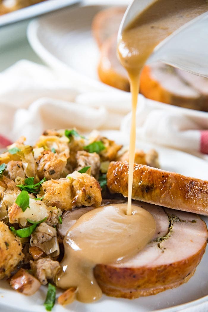 I also like to make a turkey gravy with the pan drippings from the roast as well. I usually get about 1/3 – 1/2 cup of pan drippings from this roast. This is then mixed with turkey broth (or chicken broth), and whisked in with a roux to make an incredibly flavorful turkey gravy that goes so well with the roulade!